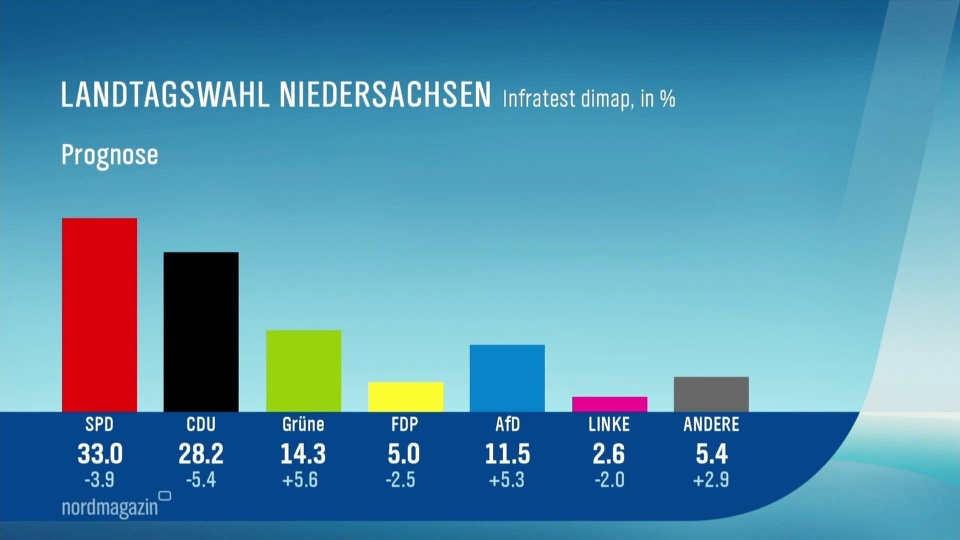 8 hours agoBei Volkswagen hat das Land Niedersachsen ein Mitspracherecht. CDU rückt bis auf zwei Prozentpunkte an SPD ran. SPD nach Prognose vorne AfD mit.